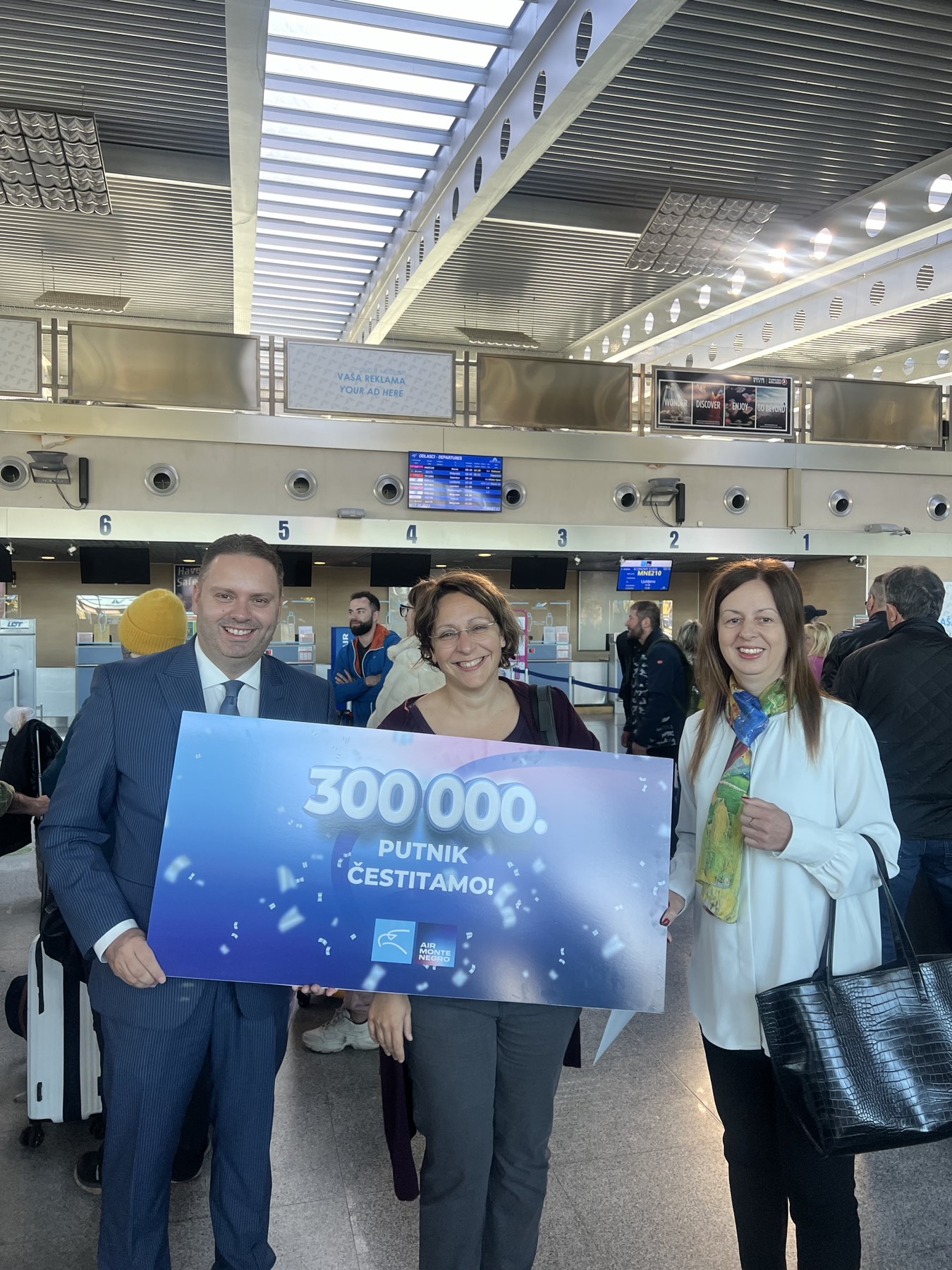 Crnogorski nacionalni avio–prevoznik prevezao je 300.000 putnika. Tim povodom vršiteljka dužnosti izvršne direktorice Air Montenegra, Dragan Frantov Nikolić i član Odbora direktora Orhan Hodžić, juče su na Aerodoromu u Podgorici obradovali 300.000. putnicu dok se čekirala za let iz Podgorice za Ljubljanu.