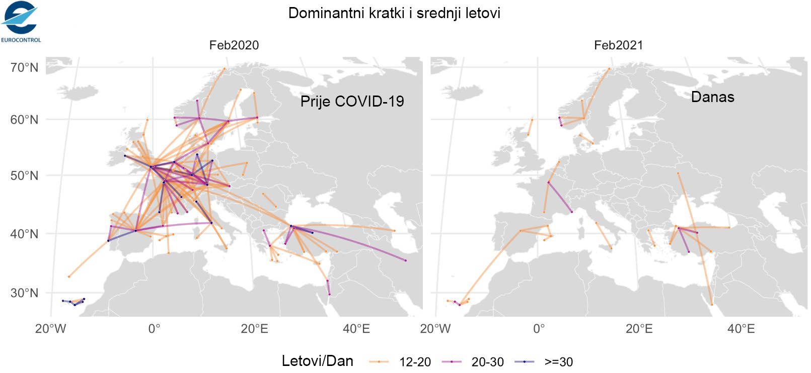 Februar 2020. bio je poslednji mjesec sa očekivanom frekvencijom saobraćaja za evropsku avijaciju, prije nego što je pandemija COVID-19 dovela do prizemljenja vazduhoplova u Evropi. U februaru 2020. bilo je mnogo visokofrekventnih veza u evropskoj mreži: 157 parova aerodroma kratkih i srednjih linija imalo je 12 ili više letova dnevno (ukupno u oba smjera).