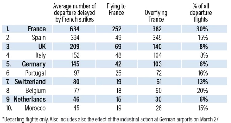 Prikaz posljedica 34 dana štrajka francuskih kontrolora letenja na okolne zemlje, Izvor: EUROCONTROL