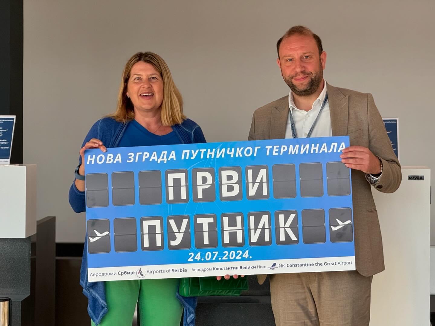 Prvi putnik iz nove zgrade putničkog terminala niškog aerodroma je Maja Tošić, ona je prva čekirala kartu za let do Atine. Putnica je dobila na dar zlatnik sa likom cara Konstantina.