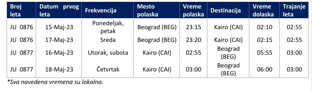 Air Serbia od 15. maja 2023. godine uspostavlja direktne letove između Beograda i Kaira. Do glavnog grada Egipta, srpska nacionalna avio-kompanija će leteti tri puta nedeljno, svakog ponedeljka, srede i petka, dok će se letovi iz Kaira do srpske prestonice realizovati utorkom, četvrtkom i subotom. Na ovoj ruti leteće avioni tipa erbas A319. Avio-karte su već u prodaji, po ceni počev od 183 evra po smeru u ekonomskoj klasi, sa uključenim svim pripadajućim taksama.