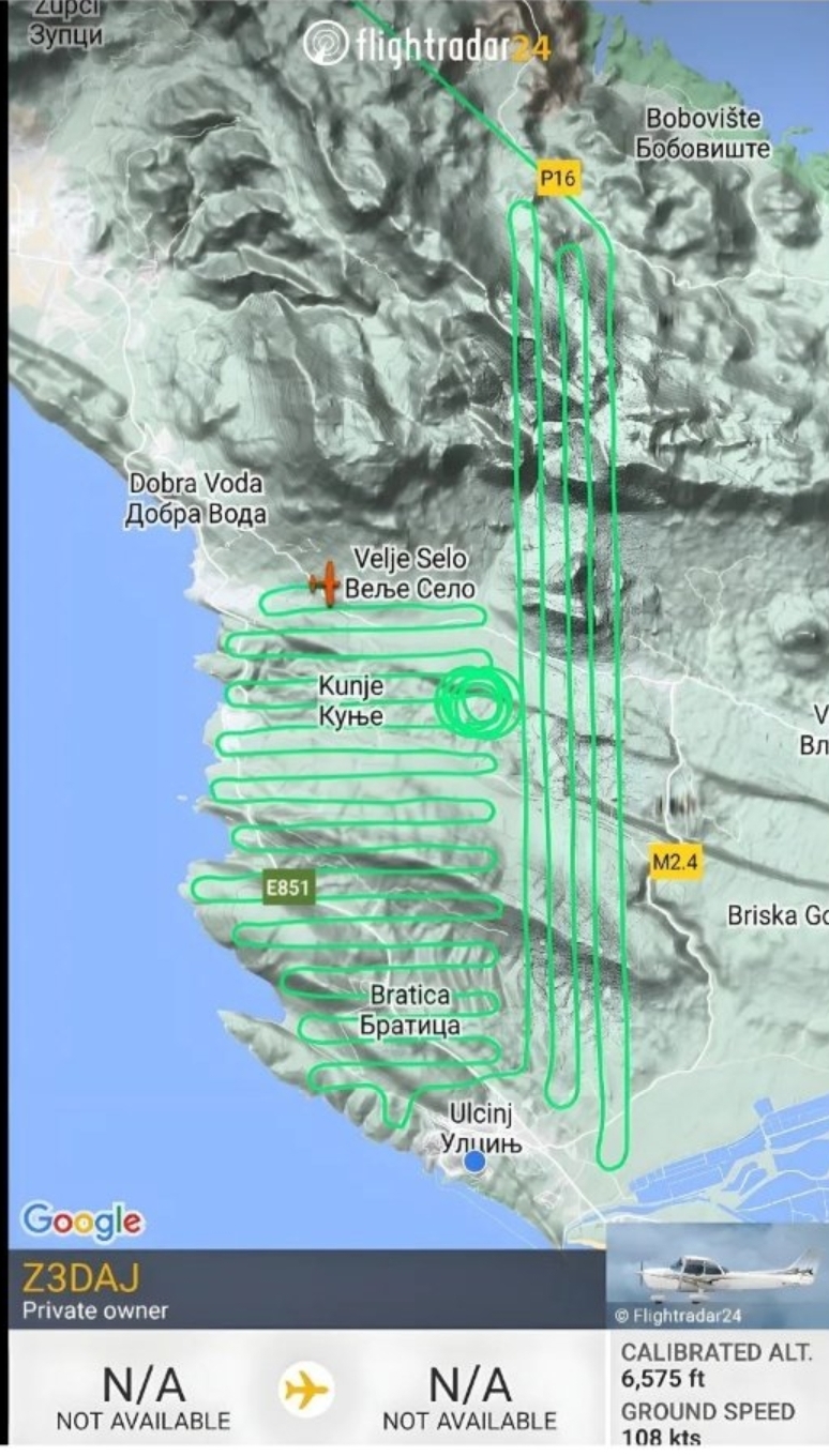 Putanja kretanja aviona za bacanje mamaca iznad dijela barske i ulcinjske opštine
