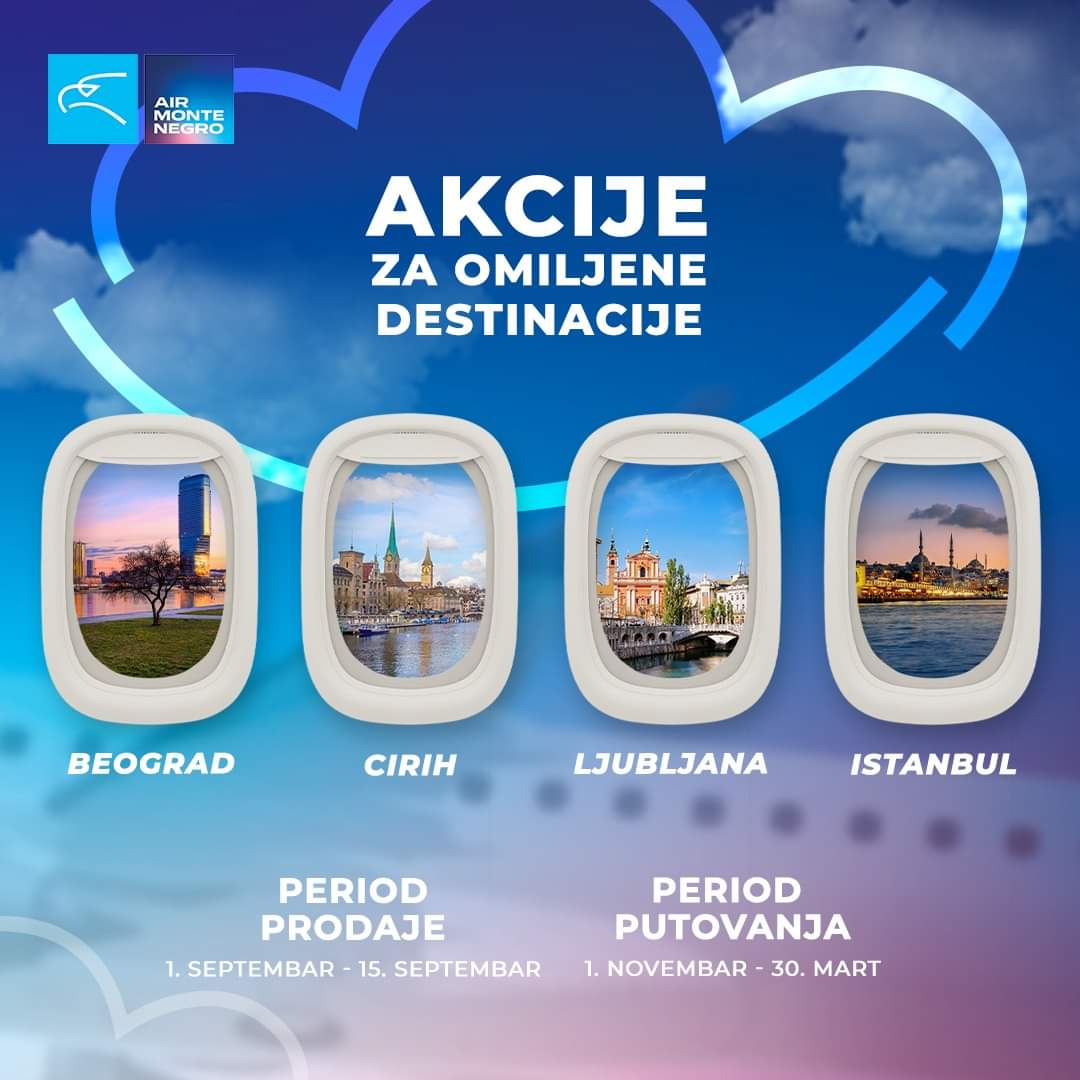 “U cilju omogućavanja građanima da ovu godinu završe, a 2024. godinu započnu putovanjima ka svojim omiljenim destinacijama, Air Montenegro je omogućio povoljnije cijene avio-karata. U promotivnu cijenu su uključene sve takse, ručni prtljag od osam kilograma i predati prtljag do 23 kilograma. Broj karata je ograničen. “, poručuju iz nacionalnog avio-prevoznika.