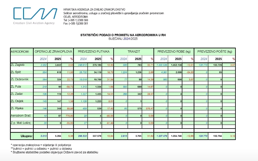 Državni zavod za statistiku Republike Hrvatske u sklopu redovnih aktivnosti prikupio je podatke i izradio statistiku čiji je izvod, u kojem se nalaze hrvatski aerodromi, upoređen sa podacima iz januara prošle godine objavila vazduhoplovna vlast Hrvatske.
