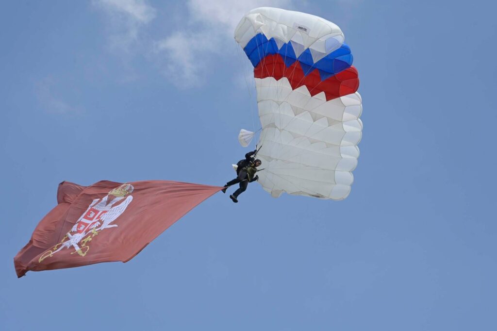 Dinamički dio prikaza završen je demo skokom pripadnika 63. padobranske brigade sa zastavama Republike Srbije i Vojske Srbije sa visine od 1.200 metara iz helikoptera „Gazela“.