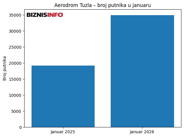 Aerodrom Tuzla je u januaru ove godine imao 34.989 putnika, što je pokazatelj oporavka ovog aerodroma nakon ponovnog otvaranja baze aviokompanije Wizz Air krajem prošle godine. Riječ je o osjetnom rastu u odnosu na januar prošle godine, kada je kroz Aerodrom Tuzla prošao 19.171 putnik. Iako su ove brojke i dalje znatno ispod januara 2023. godine, kada je zabilježeno 58.304 putnika, trend rasta ukazuje na početak oporavka.